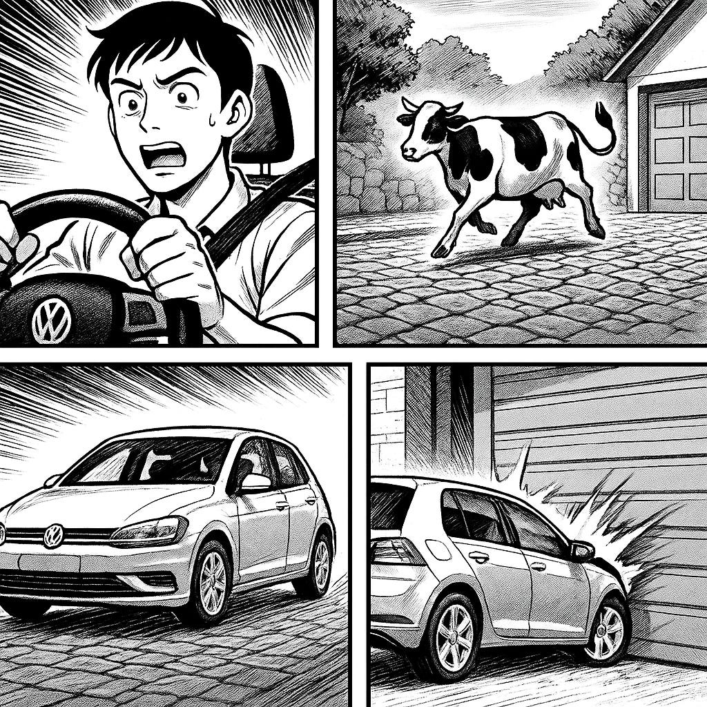Marcelo was still there when she got home. My plan was to admit to having experienced a small accident, but Marcelo had something different in mind. Before I could open my mouth, he said that a cow had jumped out into the road, which I had deftly avoided by taking a sharp turn into the garage door. According to him, I was a hero in this story.